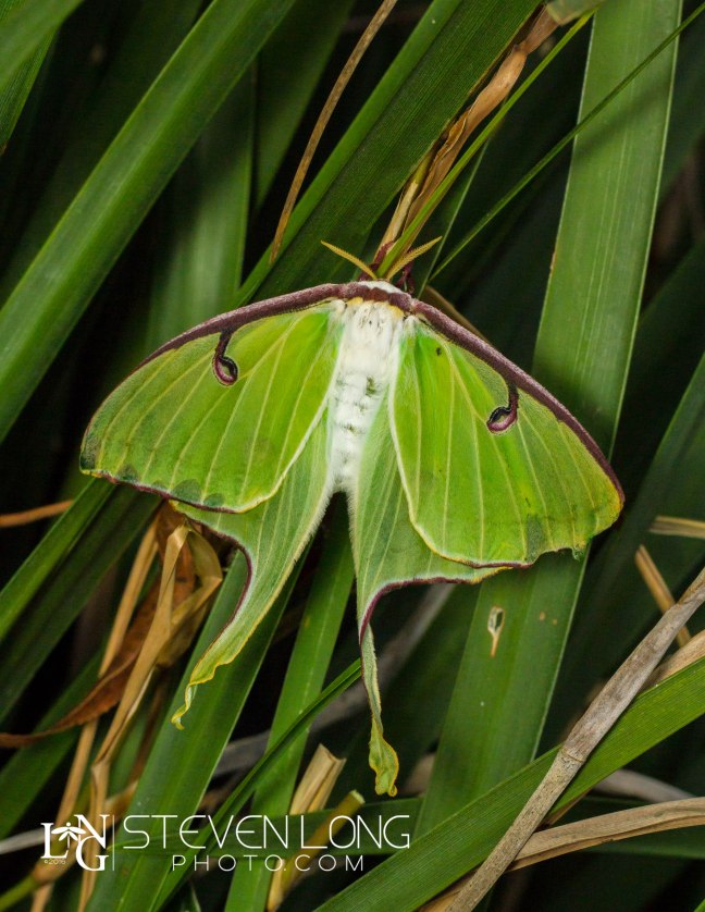 untitled-201603199009-2I have to admit I have been envious of my friends who have photographed a luna moth (Actias luna).  They are somewhat common, but elusive. I think they are particularly beautiful.  It is rare to see one in the daylight, and they only live in moth form for a few days making them that much harder to find.  Imagine my excitement when I found a newly emerged female on the irises next to my deck.